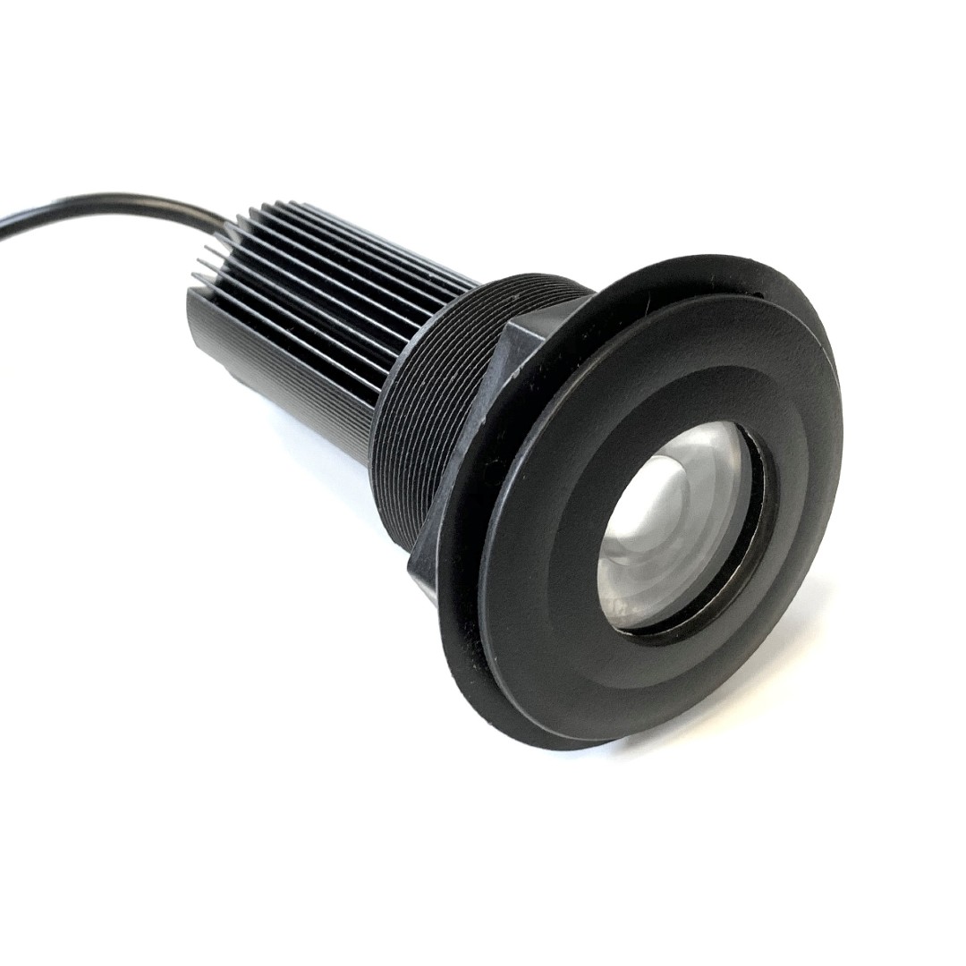 Low profile (almost flush) Though Hull Underwater Light. The compact body is made from reinforced plastic with efficient aluminium fins for cooling.