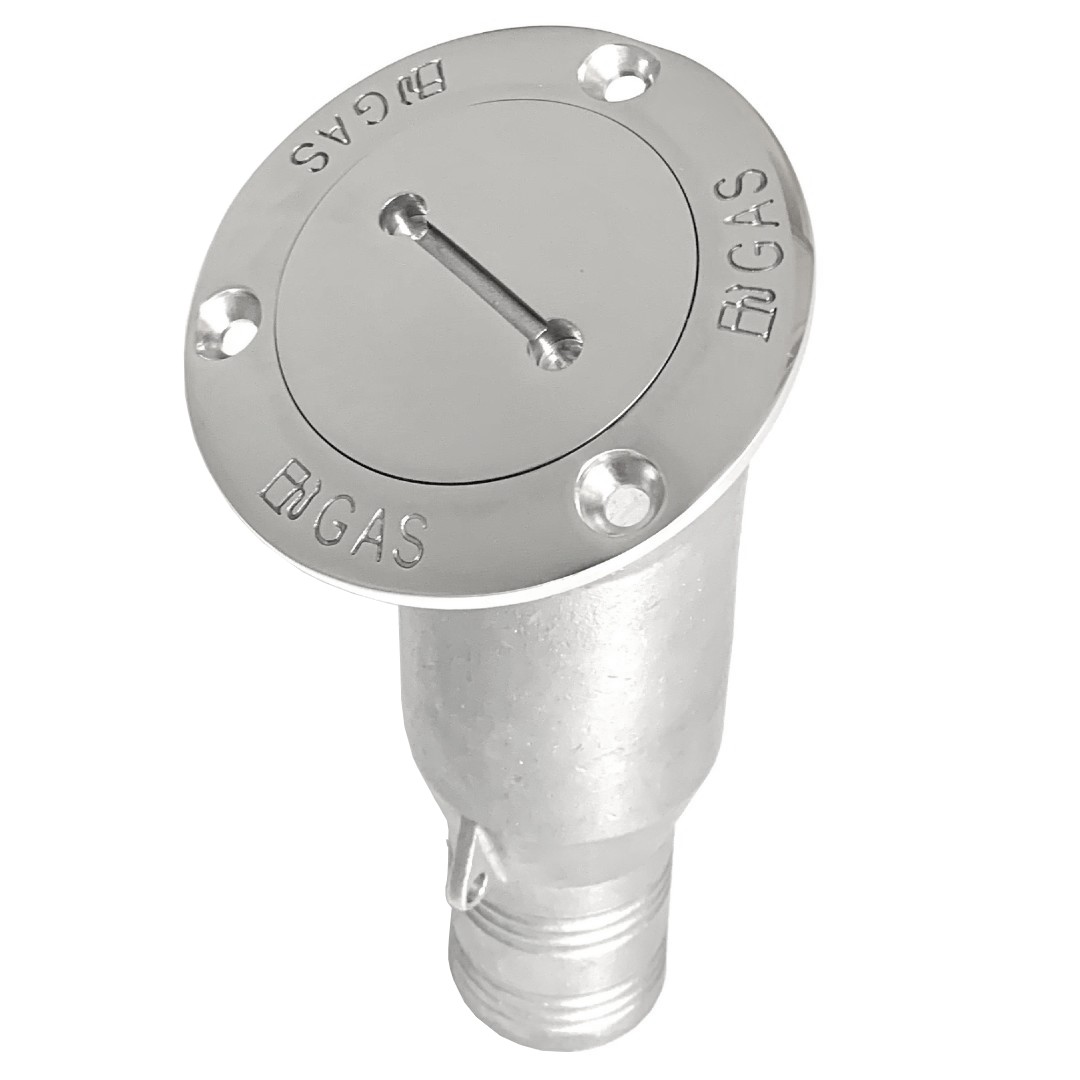30 Degree gas deck fill made from marine grade 316 stainless steel. The 30 degree angle allows for vertical mounting, allowing you to fill up as you would with your car. Extended for a 2" hose.