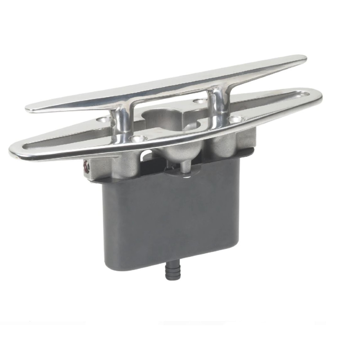 Made of marine grade 316 stainless steel. Each cleat is supplied with a waterproofing cup which prevents any water running off below the deck. Each cleat is supplied with a backing plate which also serves as a cut-out template. Easily fastened with 4 5/16" diameter screws (not supplied).