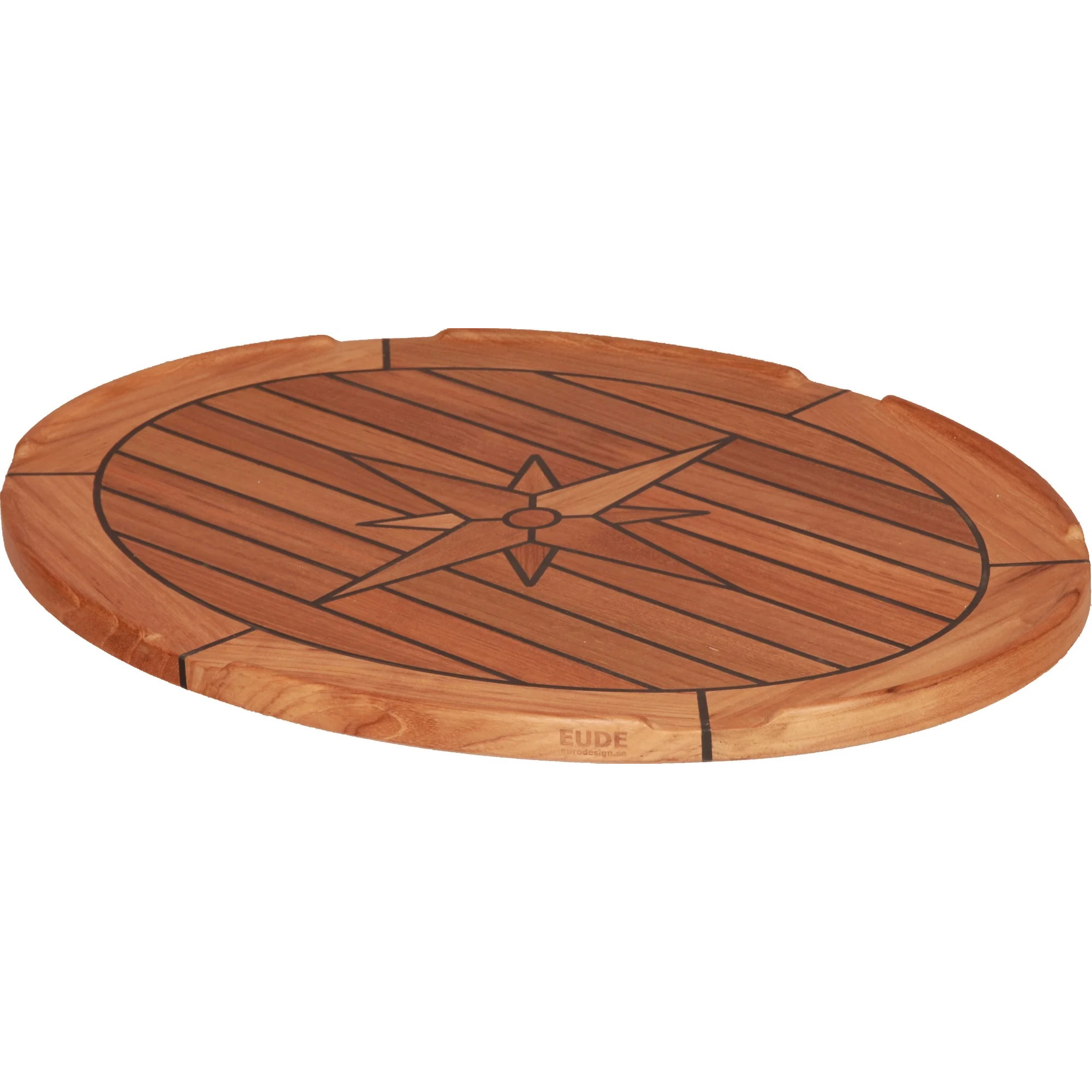 The ellipse-shaped teak tabletop with a Nautic star in the middle and fiddles around the table is made with a plywood core with a 4mm solid teak on top finished with a plastic backing on the underside of the table. Teak is renowned for its durability, resistance to weather elements, and natural beauty. With its distinctive shape and elegant Nautic star design, this table adds a touch of charm to any boat. The fiddles around the table provide additional functionality, preventing items from sliding off the surface and is available in three sizes:
