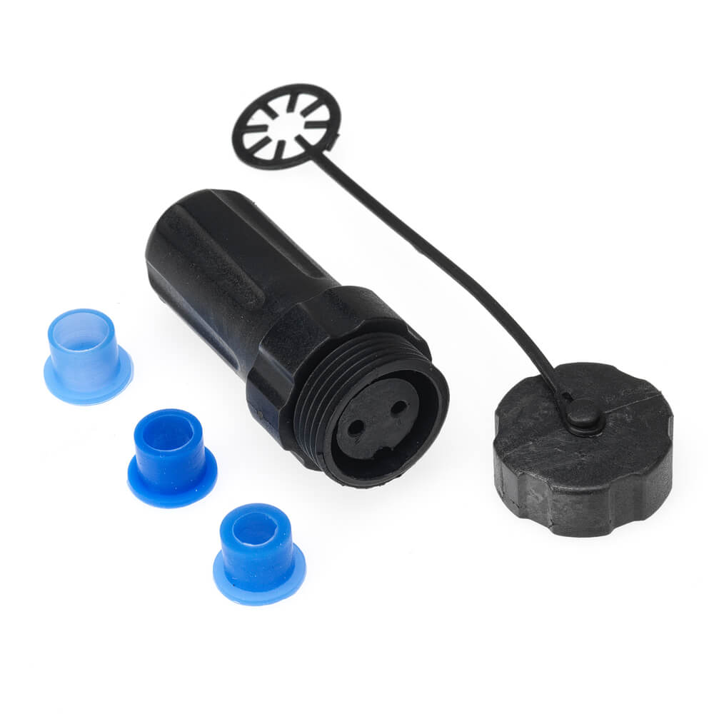 The screw terminal in-line female socket is available in: 2 pin, 3 pin and 4 pin variants. IP68 Rated, 3 pre-formed bungs included.