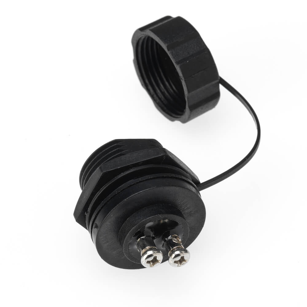The screw terminal panel-mount socket (female) is available in: 2 pin, 3 pin and 4 pin variants. IP68 rated, comes with protective cap.