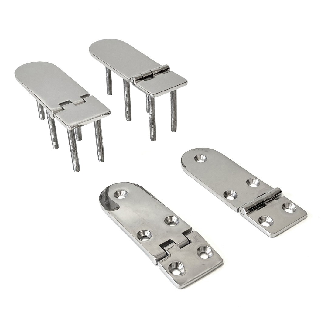 These heavy-duty hinges are manufactured from cast 316 Stainless Steel and are hand polished for an elegant finish. They can be supplied in four configurations. Top pin (hinge opens 180 deg.), under pin (hinge opens 95 deg.), countersunk (for surface mounting) or studs (for under mounting).