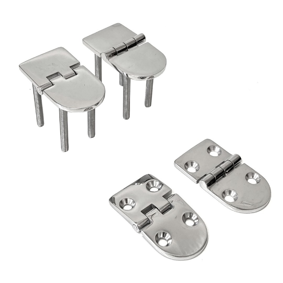 These heavy-duty hinges are manufactured from cast 316 Stainless Steel and are hand polished for an elegant finish. They can be supplied in four configurations. Top pin (hinge opens 180 deg.), under pin (hinge opens 95 deg.), countersunk (for surface mounting) or studs (for under mounting).