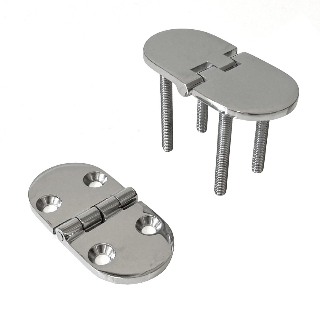 These heavy-duty hinges are manufactured from cast 316 Stainless Steel and are hand polished for an elegant finish. They can be supplied in four configurations. Top pin (hinge opens 180 deg.), under pin (hinge opens 95 deg.), countersunk (for surface mounting) or studs (for under mounting).