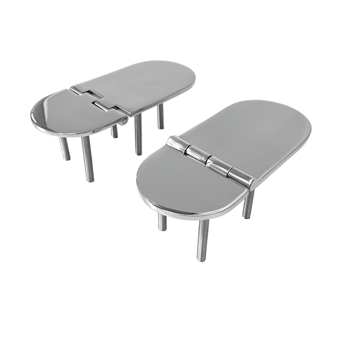 These heavy-duty hinges are manufactured from cast 316 Stainless Steel and are hand polished for an elegant finish. They can be supplied in four configurations. Top pin (hinge opens 180 deg.), under pin (hinge opens 95 deg.), countersunk (for surface mounting) or studs (for under mounting).