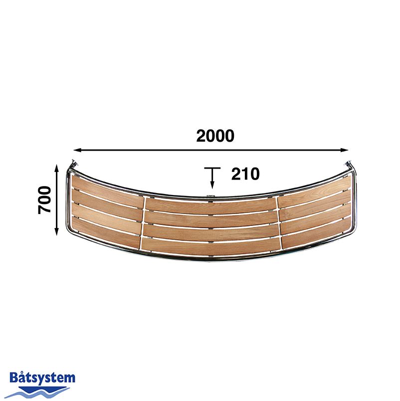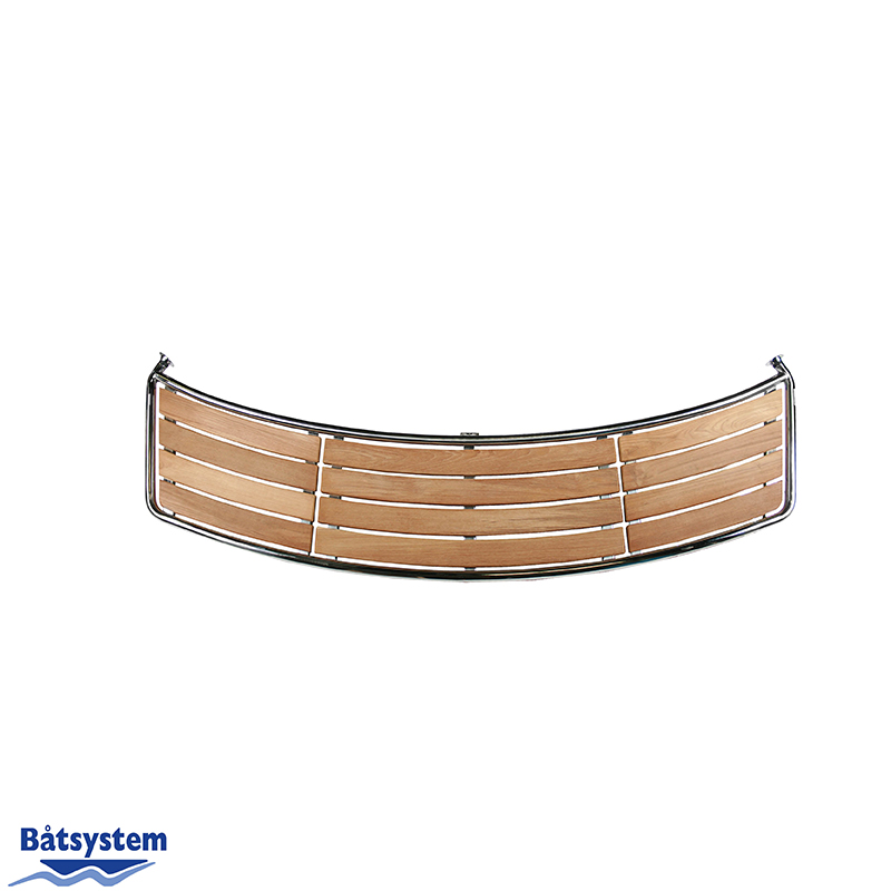A bathing platform for a boat with a rounded stern. Solid teak surface with 316 stainless steel fittings.