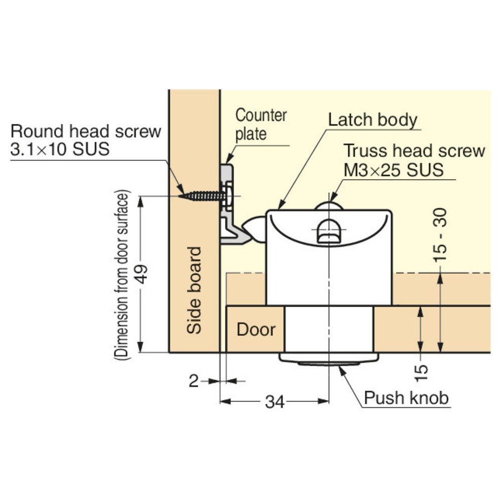When the knob is pushed in, the product becomes flush with its surroundings for a safe and smart design. Pushing the knob in while the door is closed will lock it. Pushing the knob again will unlock it.