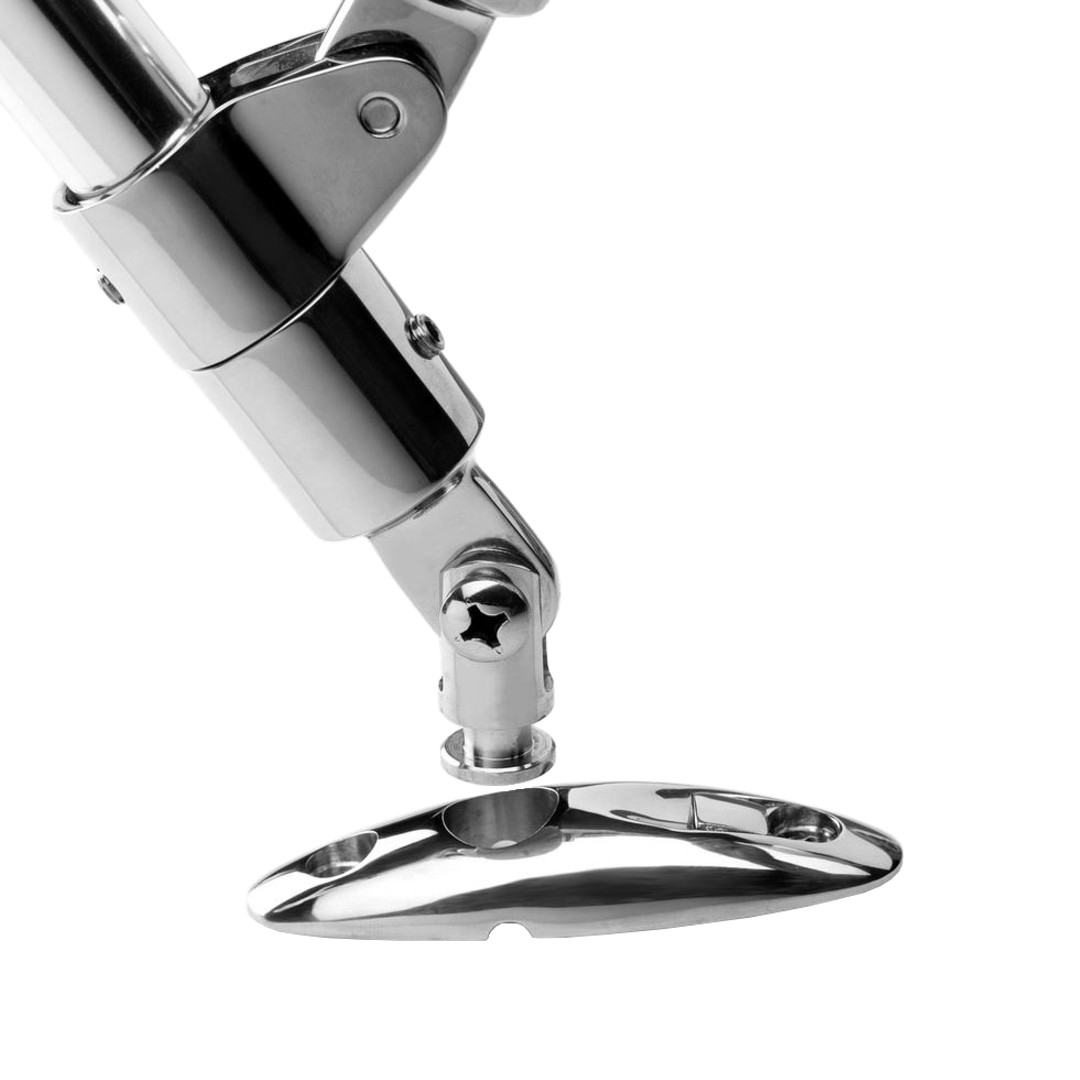 Easily remove or install top without having to keep track of screws and pins. The hinge snaps into base and stays attached to Bimini when separated.