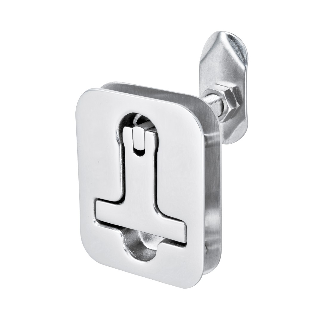316 Stainless Steel spring loaded 'T' handle spring loaded latch for anti-rattle operation. Simple rectangular cut put with hidden fasteners and backing plate. Available in a non locking or locking version.
