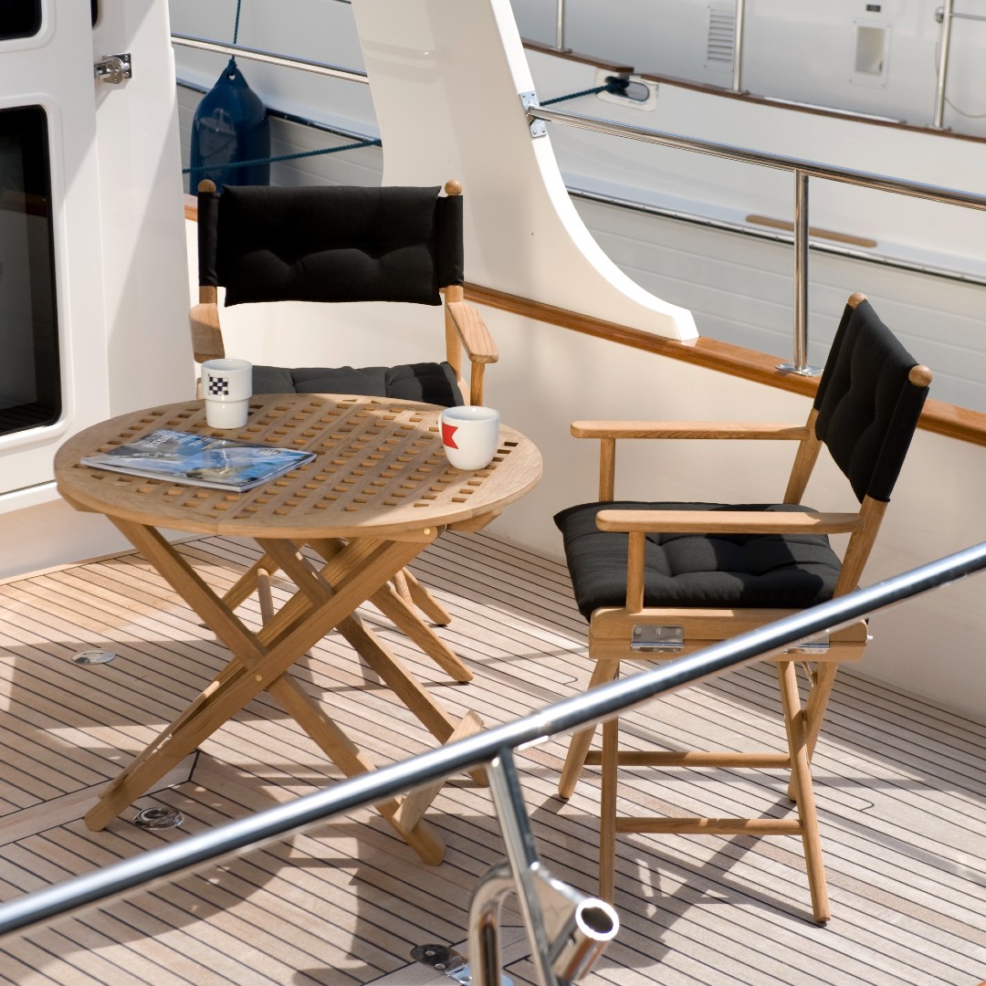 Our Directors Chair is one of our more practical items. It's features include being able to fold the chair away when not in use, saving valuable space on board, thanks to the 316 stainless steel fittings. The Directors Chair also has rubber feet to protect your deck or polished floor.