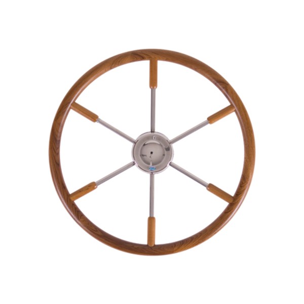 Beautifully made 6 spoke solid teak Stazo steering wheel. Solid teak outer hoop with stainless steel centrepiece.
